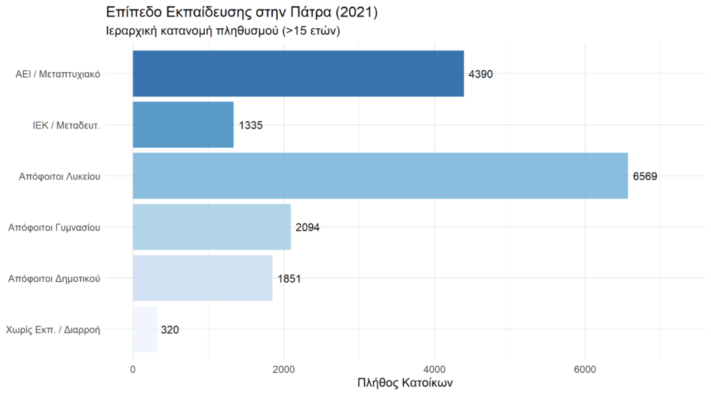 Αν κοιτάξουμε το εκπαιδευτικό επίπεδο του πληθυσμού του Δήμου Πατρέων, για το έτος 2021 προκύπτουν οι εξής παρατηρήσεις: