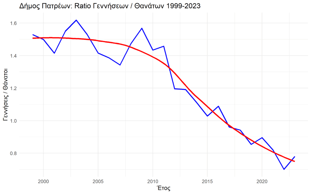Τα ανοιχτά δεδομένα του Δήμου Πατρέων μάς βοηθούν να δούμε πώς εξελίχθηκε η φυσική κίνηση του πληθυσμού τα τελευταία 25 χρόνια και τι μπορεί να σημαίνει αυτό για το μέλλον της πόλης.
