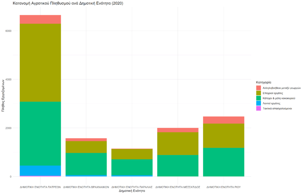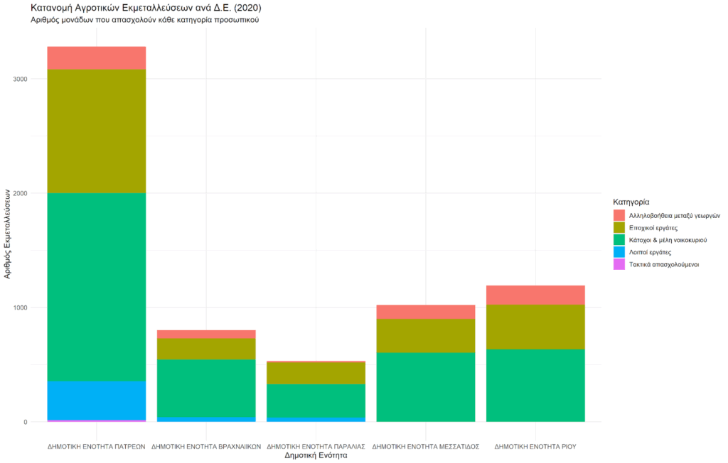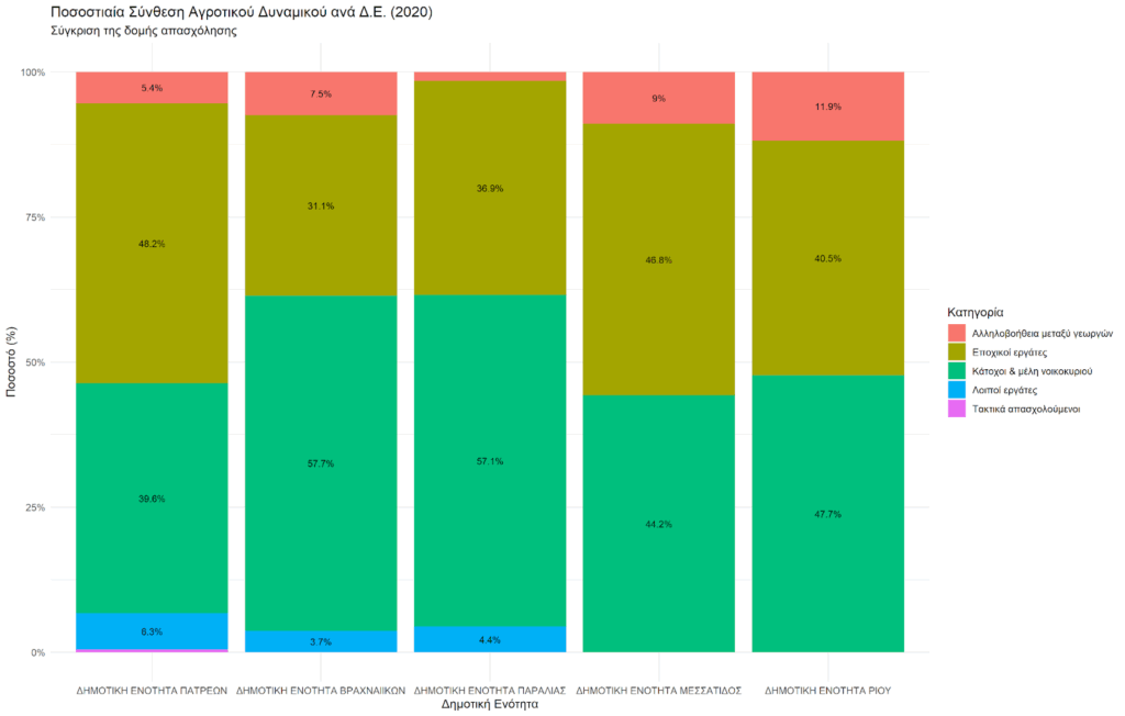 - Δ.Ε. Ρίου (2,30) και Δ.Ε. Παραλίας (2,17): Παρατηρούμε ελαφρώς αυξημένη αναλογία. Αυτό υποδηλώνει είτε την ύπαρξη εκμεταλλεύσεων με μεγαλύτερες ανάγκες σε εργατικά χέρια, είτε μια πιο ενεργή συμμετοχή περισσότερων μελών της οικογένειας στην παραγωγή.